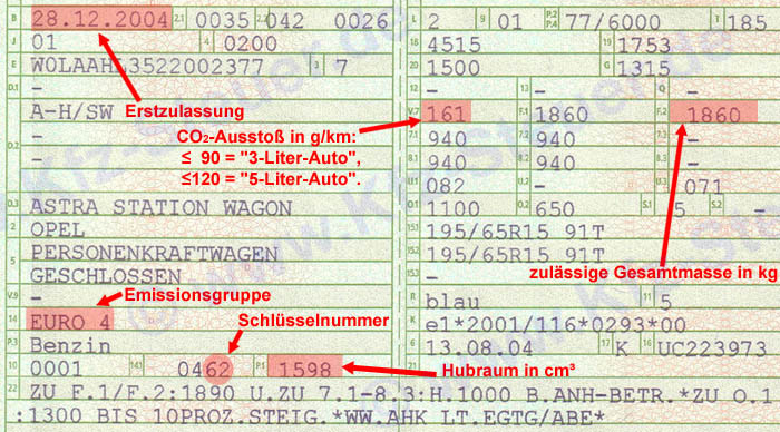 Antriebsart, Hubraum, CO2-Emission, 3- oder 5-Liter-Unterscheidung, Emissionsgruppe, Erstzulassung, Schlüsselnummer, zulässige Gesamtmasse
